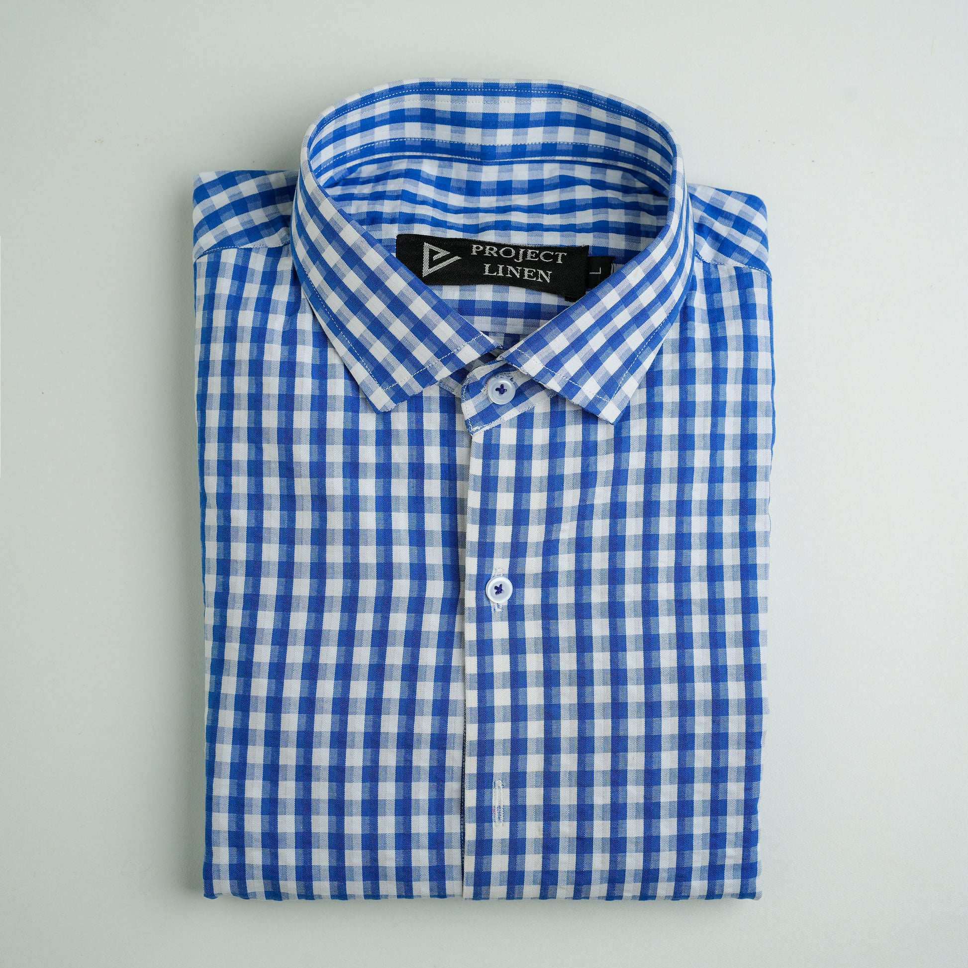 Royal Blue White Check Seersucker Linen Shirt - Her's